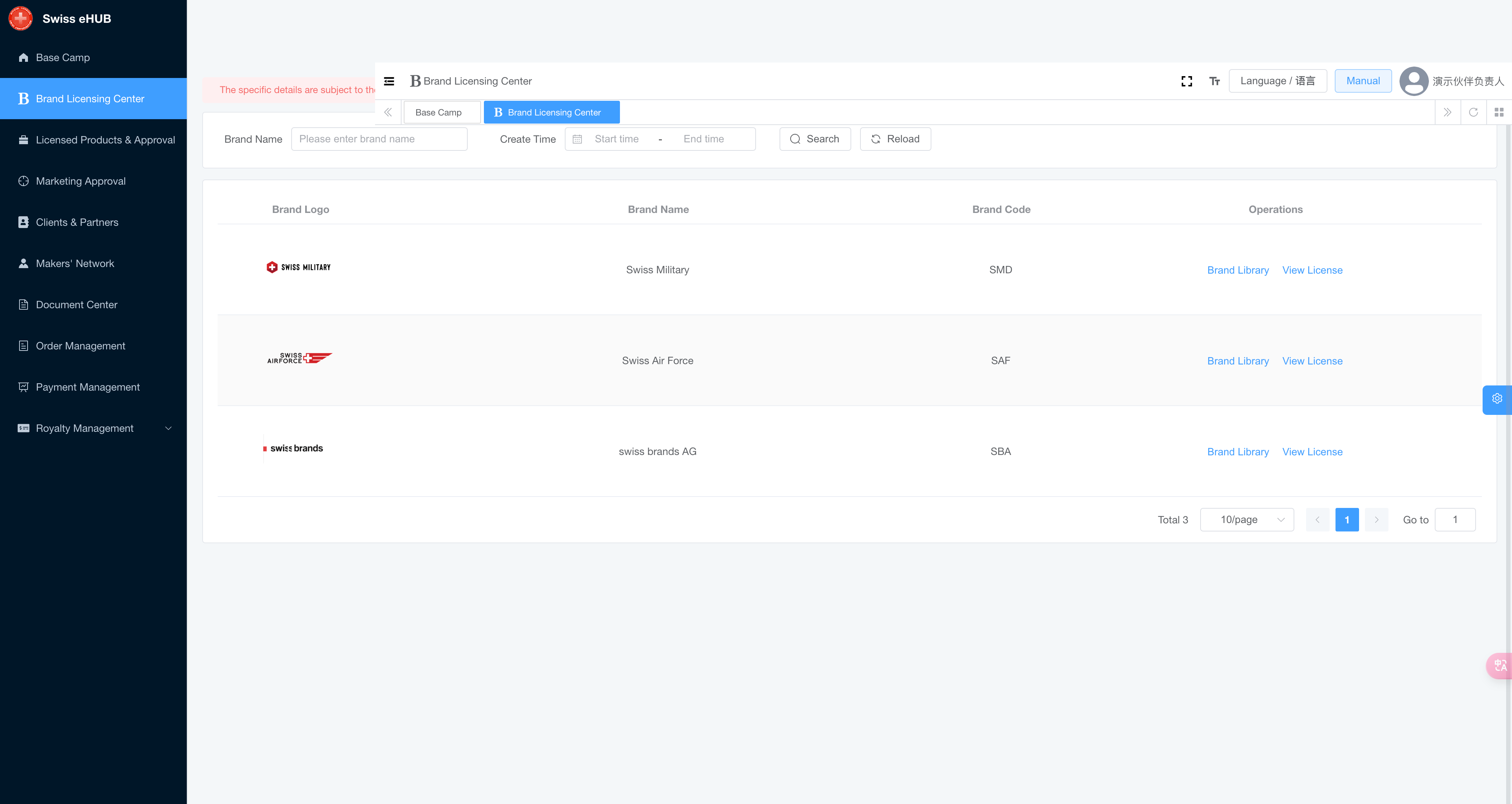 The "Brand Licensing Center" page allows users to manage and view licensing information for different brands. Below is a detailed introduction and operational guide for this page.